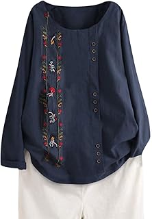 Damen Oberteile Elegant Langarm Bluse Baumwolle und Leinen Löwenzahn drucken Lose V-Ausschnitt Oversize Tunika Casual Top Locker Langarmshirts mit Knopfleiste Frauen Hemd Pullover Sweatshirt S-XXXXXL