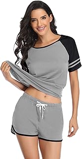 Damen Schlafanzüge Baumwolle Trainingsanzüge Pyjama Raglanärmeln Hausanzug Freizeitanzug Sportanzug T-Shirt und Shorts Set Streifen Nachtwäsche für Sommer